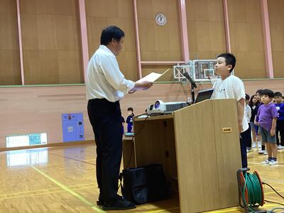 理科作品展で、優秀な成績を残した 小野内くんに 表彰状が渡されました。