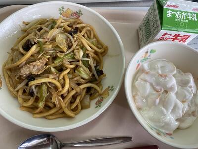 この日の【メニュー】なみえ焼そば 牛乳 フルーツヨーグルト和え