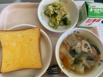 この日の【メニュー】フレンチトースト 牛乳 ブロッコリーサラダ 冬野菜スープ