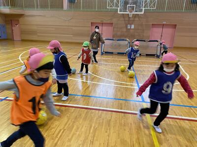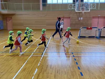 2学期最後の行事として「キッズサッカー」を行いました。1学期にも行い、全園交流会でも行い、回を重ねてきたことにより、ボールに親しみながら楽しく活動できるようになっています。