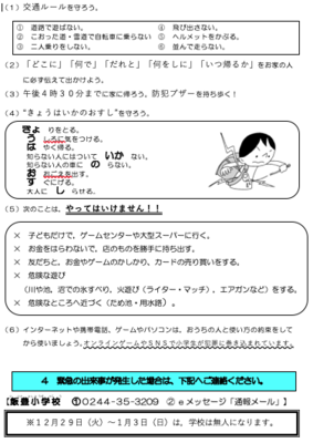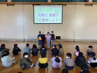 終業式後に、生徒指導担当と学力向上担当から安全で充実した冬休みのコツを話しました。生徒指導からは、休み中も飯豊小の「スマイル宣言」を忘れずに過ごすこと。学力向上からは、3学期始まってすぐの1月12日(木)には「相馬市学力調査」があるので時間を上手に使った勉強について。