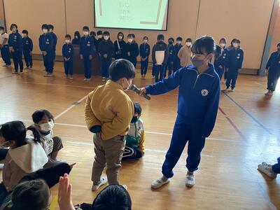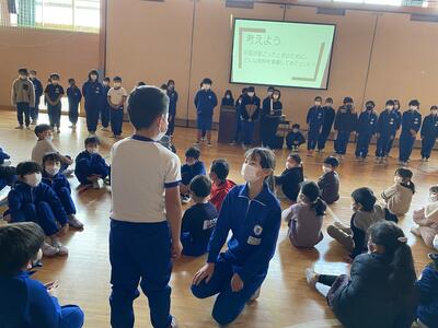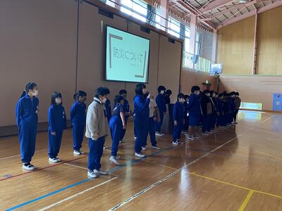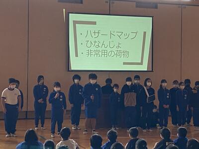 5年生は総合的な学習の時間において、【 防災 】について学んでいます。全校集会の場で、その成果を発表するのが飯豊小学校の伝統的な取り組みになっています。この日は、1年生にもわかりやすいようにと、備えておくべき食料について問題提起をするような方で発表をしました。5年生は10歳から11歳であり、東日本大震災を経験していません。しかし、被災地に暮らす一人として、自分の言葉で災害や防災について語ることができるようになる必要があると考えています。飯豊小学校では、これからも防災教育を大切にしてまいります。