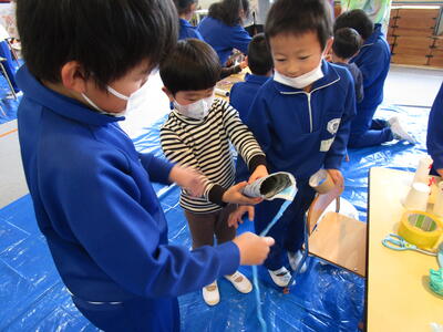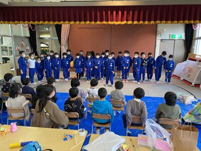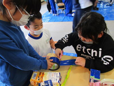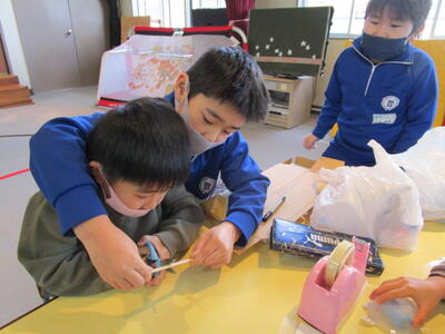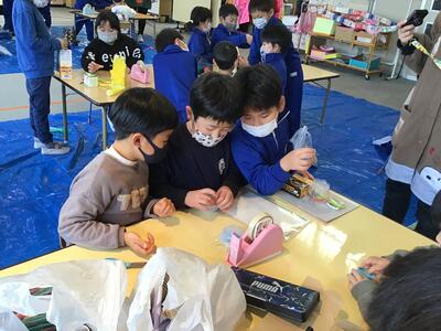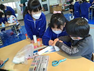 飯豊幼稚園出身の2年生もいますが、他の幼稚園や保育園出身にとっては初めて園舎でした。少し緊張している様子もありましたが、それ以上に、2年生として幼稚園児にやさしくおもちゃ作りを教えることへの使命感に燃えていました。とっても立派なお兄さん・お姉さんでした。幼稚園児たちにとっても、楽しいうれしい時間になったようです。