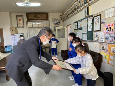 給食の時間に、テレビ放送を使って表彰を行いました。(人と名前が一致しないようここでの名前紹介は控えます。)