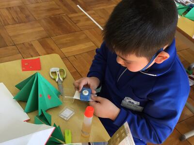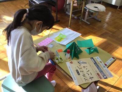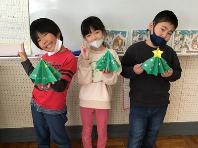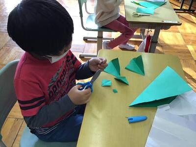 なかよし学級の1では、自立活動の一環としてみんな楽しみにしているクリスマスにちなみ、クリスマスツリーを手作りました。長方形の画用紙からツリーのベースとなる正方形を切り出したり、型抜きを使って飾りをつくったりしながら楽しく活動しました。