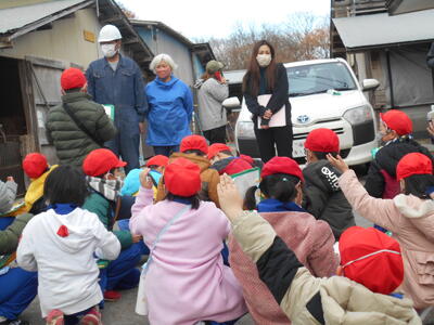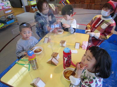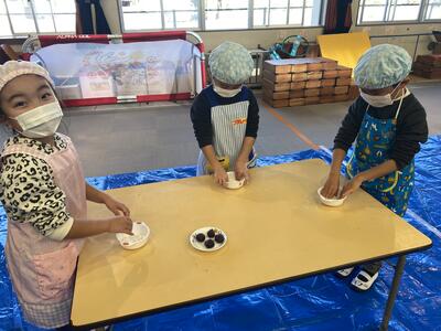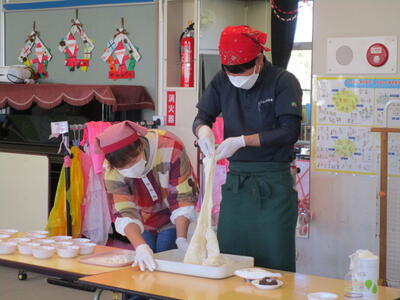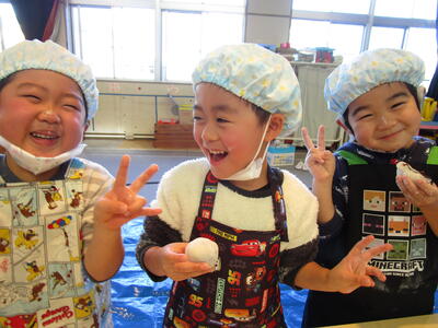 幼稚園では、食農事業を展開してくださっているJAふくしま未来の髙田様にお世話になり、「お餅パーティー」を行いました。メインの活動は、大福づくりです。蒸して調理していただいたお餅であんこ玉を包む作業です。まずは、手に打ち粉をして、丸いお餅を平らにしました。次に、そのお餅の真ん中にあんこ玉をのせて、お餅の端っこをつまみながら包んで丸くしました。まん丸大福の完成です。出来上がった大福は、お餅が固くなる前にその場で食べました。あんこが苦手な園児もいますが、せっかく自分で作った大福だからと自然に口に運んでいました。残ったお餅で、お雑煮をつくってもらいみんなで美味しく食べました。美味しくて楽しいお餅パーティーでした。