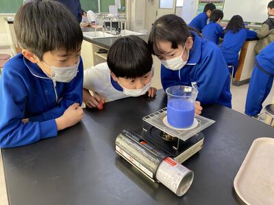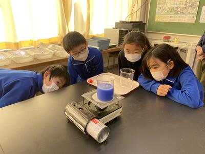4年生は、理科「ものの温まり方」の学習で、金属・空気の温まり方について学んできました。この日は、最後の水の温まり方について学習しました。金属や空気の温まり方を踏まえて、どんなふうに温まるのかを予想して実験をしました。温度の変化がわかりやすいように、支温インクを水に混ぜて実験しました。支温インクは、温度が高くなるとブルーからピンクに色が変化します。みんなその瞬間を見逃さないよう、食い入るようにビーカーを見つめています。