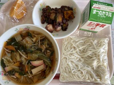 【メニュー】 〇すき焼きうどん 〇牛乳 〇白玉入り冬至かぼちゃ 〇みかん