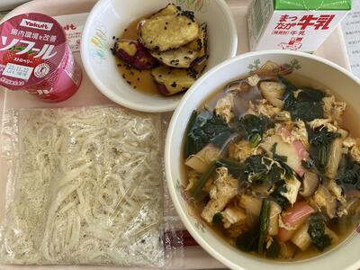 【メニュー】親子うどん・牛乳・大学いも・ソフール