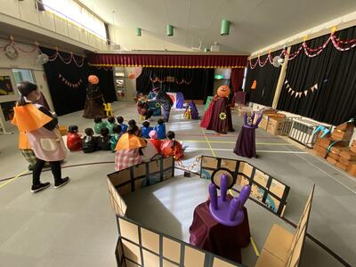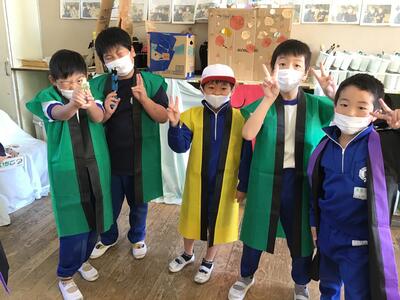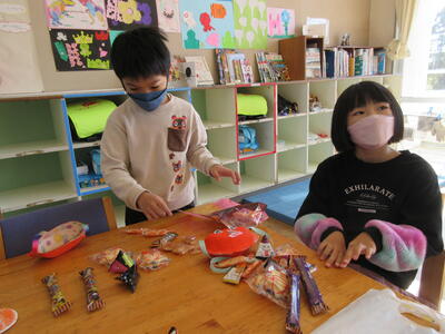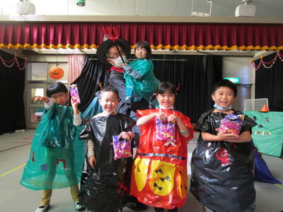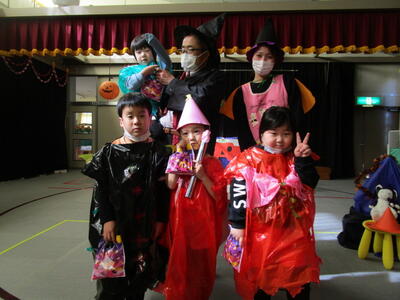 この日幼稚園のホールは、大変なことになっていました。そう、年に一度のハロウィーン仕様に大変身です。今年は、子どもたちも仮装をして楽しみました。「トリックオアトリート」の呪文を唱えて会場に入り、お菓子を探しました。別世界になっていたホールにドギマギしながらも見つけ出すことができ、全員で記念撮影をしました。