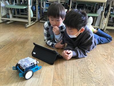 2年生もmBot(プログラミング)を体験しました。2年生と言えども、小さなときからゲームで培ってきた感性を駆使し、自分で試行錯誤をしたり友達と話し合ったりしながらロボットを制御するためのプログラミングを行いました。