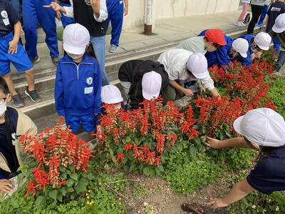 来週27日(木)の花いっぱい運動に向けて、花壇の整備を行いました。いつものスマイル班ごとに、自分たちの担当エリアに植えてある夏の花を抜きました。