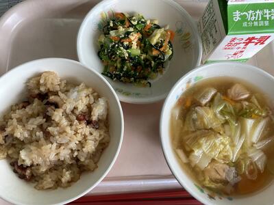 【メニュー】タコ飯・牛乳・ほうれん草ごま和え・どさん子汁