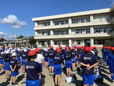 幼稚園に続いて小学校のマラソン記録会です。小学校は、校舎北側の農道を走ります。この日は、風もなく暑すぎなく、絶好のマラソン日和でした。開会式は、校庭で合同で行いました。