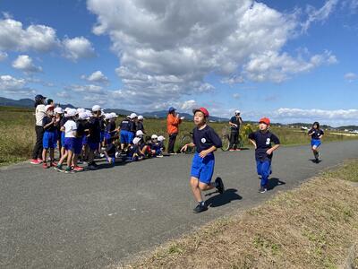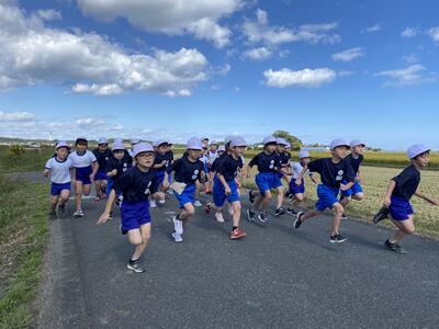 「1・2年生は、1300m。1年生にとっては、こんなにも長い距離を走る大会は初めてでしょう。ドキドキするね。3・4年生は、1800m。5・6年生は、2300mの距離です。どの学年にとっても、とても長い距離なので、頑張れなくなって心が折れそうになる時があるでしょう。でも、実はその時こそ成長のチャンスなのです。負けそうになる心をちょっとだけ我慢してみましょう。自分の限界をちょっとだけ前に押してみましょう。1位にはひとりにしかなれませんが、自分の中での1位、自己記録更新は誰にでもチャンスがあります。ぜひ、成長のチャンス・自己記録更新のチャンスを手に入れてください。みんなで全力で応援します!」