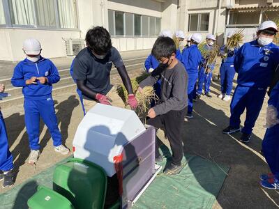 ★稲から米をはずす。使う機械は、脱穀機。足でペダルを踏んで中のローラーを回転させて脱穀する。中に手を入れたら大怪我になる。