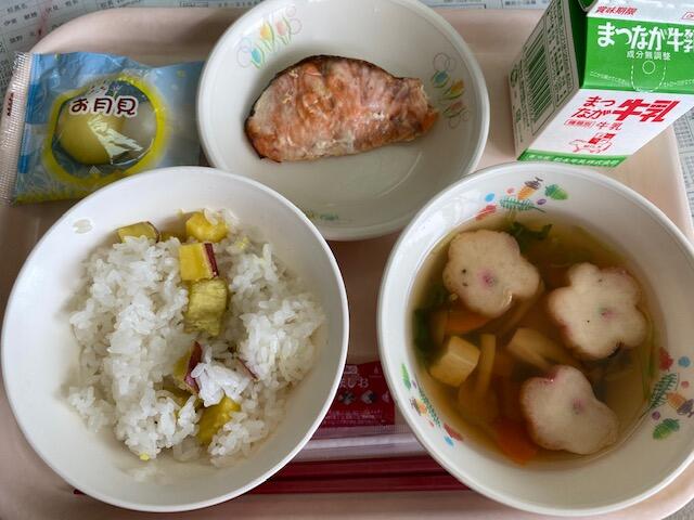 【メニュー】 〇サツマイモご飯 〇牛乳 〇すまし汁 〇ごま塩 〇お月見団子