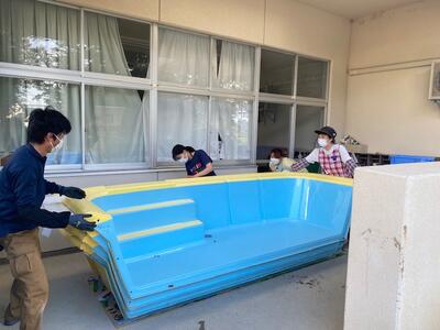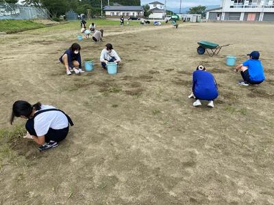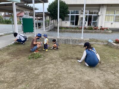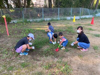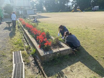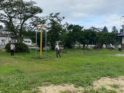 作業内容は、草むしり・機械による草刈り・側溝の泥上げをお願いしました。また、幼稚園では、夏にお世話になったプールを片付けていただきました。子どもたちもたくさん参加してくれました。自分たちの幼稚園や学校を自分たちの手できれいにする態度が素晴らしいです。