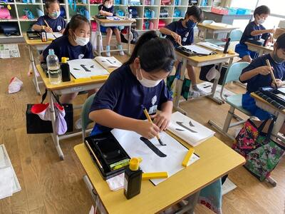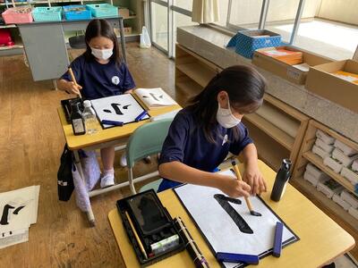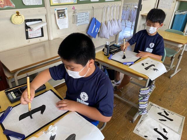 3年2組の習字は、教頭が担当しています。今日のテーマは、「漢字の筆づかい:はね・はらい」です。良い姿勢で、筆を立てて、集中して取り組みました。