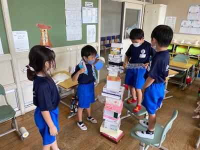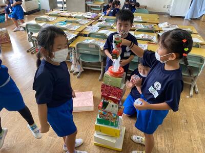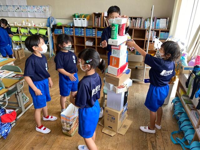 1年生の算数科では「かたちあそび」という単元の学習があります。この学習は、図画工作科の「いっぱいつかってなにしよう」という活動と連動させて行う学習です。今日は、最初の時間としてお家から持ってきたたくさんの箱を、高く積み重ねる活動を行いました。グループで、箱の大きさや形の重ね方を話し合いながら活動をしました。
