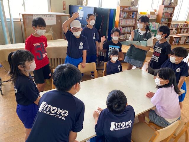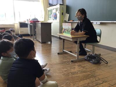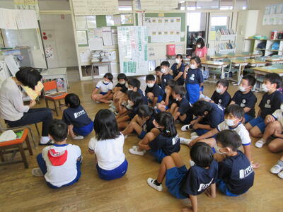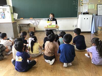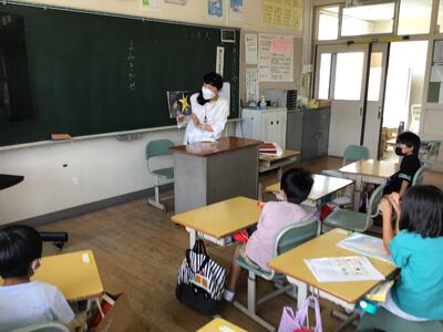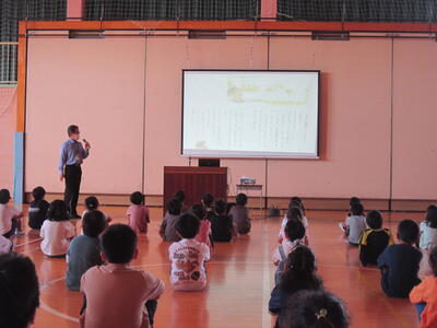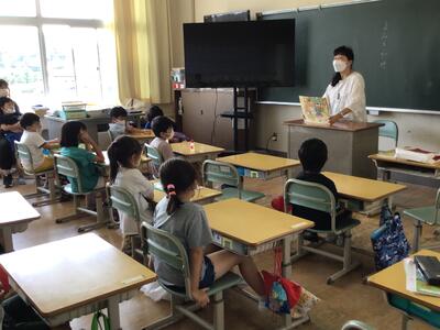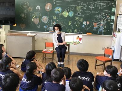 蓬田由紀子様は、1年2組で「オムイスへい」「へっこきよめどん」「かっぱのすもう」を読んでくださいました。