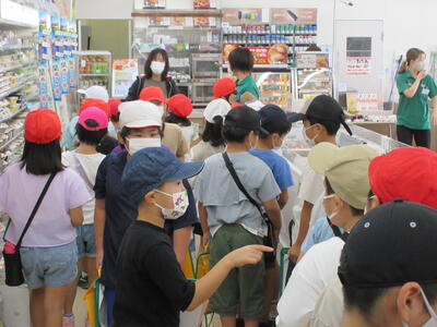 「セブンイレブン」では、普段の買い物では目にすることがないバックヤードも見せていただきました。子どもたちは、セブンイレブンの名前の由来・一番売れる商品・一日の来客数・品数などの興味をもって質問をしました。