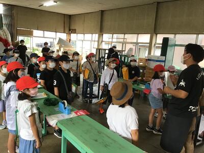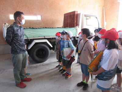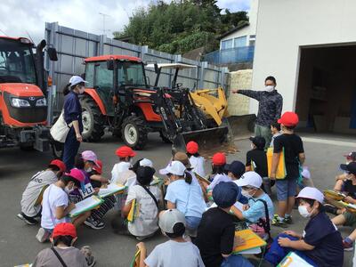 「佐藤農園」では、R君のお父さんに、米農家の仕事について教えていただきました。また、大きなトラクターも見せていただきました。子どもたちは、仕事をやっていてよかったこと・機械や道具について興味をもって質問をしました。