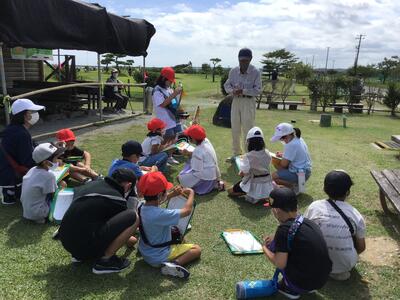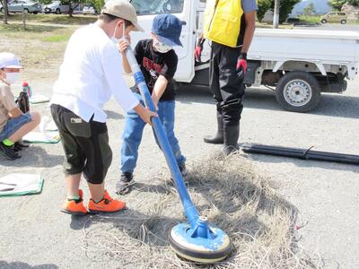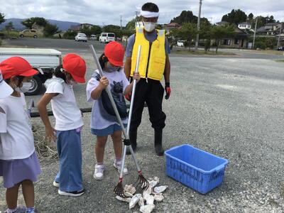 「パークゴルフ場」では、実際にパークゴルフ体験をさせていただきました。また、Hさんのお爺さんである漁業者の羽根田さんが駆けつけてくださり、胴長・ライフジャケット・ハチマキに変身してお仕事について教えてくださいました。また、カキ・アサリ・海苔の収穫道具を陸地で実際に操作させていただきました。子どもたちは、仕事の大変なこと・道具・一日の流れなどついて興味をもって質問をしました。
