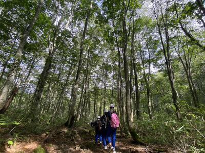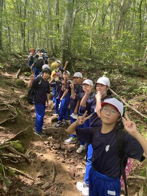 帰り道もブナ林の中をマイナスイオンを全身で浴びながら降りました。体力的にだいぶキツくなってきていた子も数名いましたが、そこは帰り道、みんなで励まし合いながら一人も遅れずに出発地点に戻ってくることができました。