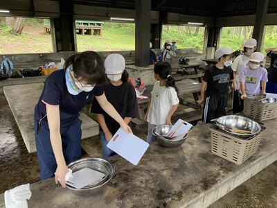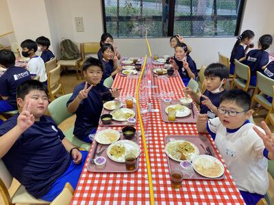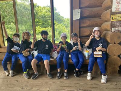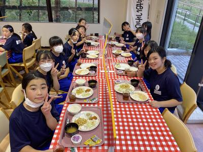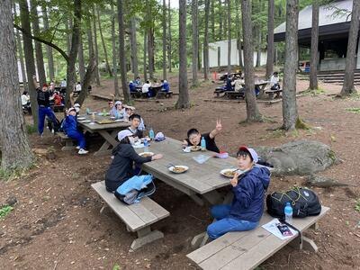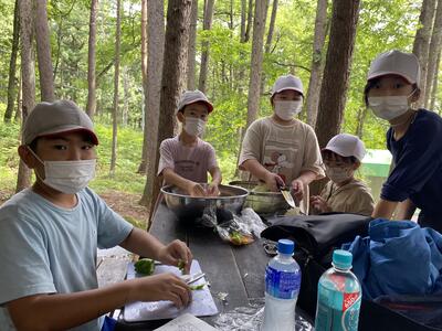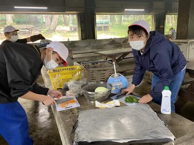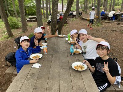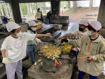 いただきますは、班ごとに青空の下でしました。途中小雨が降り始めるハプニングがありましたが、それも美味しい調味料に感じられるほど、どの班も美味しい焼きそばに仕上がりました。