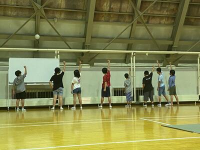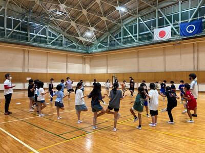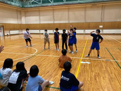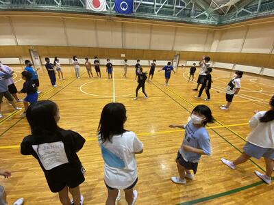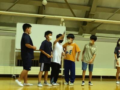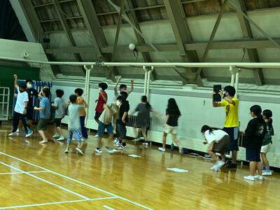初日最後の活動は、体育館でレクレーションを行いました。このレクレーションは、1学期に学級ごとに学級会を行なって話し合ってきたものです。お風呂上がりに、体育館で、学級30分の持ち時間という条件に沿って話し合ってきました。