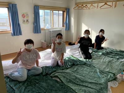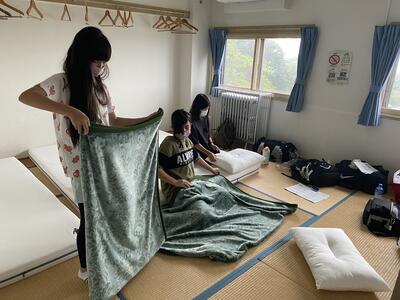 最終日の朝です。宿泊学習は、ここからが大変です。いわゆる「きた時よりも美しく」の精神です。しっかり復元をしてお返ししなくてはなりません。部屋の掃除のみならず、結構手こずるのが、布団や毛布をきっちりとたたむことです。