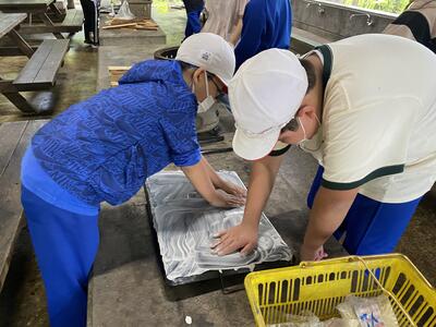 かまど、鉄板、包丁、ザル、ボール、材料などを準備したら、早速調理開始です。グループごとに、火を起こす人、鉄板の裏にクレンザーを塗る人、材料を切る人に分担をしました。火おこしは順調です。グループで声を掛け合って作業を進めました。予定していた、10時半前にはどのグループも炒める準備完了していました。いただきます予定の11時には、片付けもある程度済ませてしまう手際の良さ。素晴らしい‼️