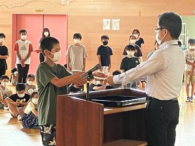 飯豊小学校の「学力向上」の取り組みの一つに、学期に1回ずつ「チャンピオンテスト」を行っています。学期内の国語と算数の学習内容の定着度を確かめます。90点以上が合格となります。1学期の国語の合格者は、98名。算数の合格者は130名でした。それぞれの教科の代表児童に賞状を渡しました。夏休み中にしっかり復習をして、2学期の学習に備えてほしいです。