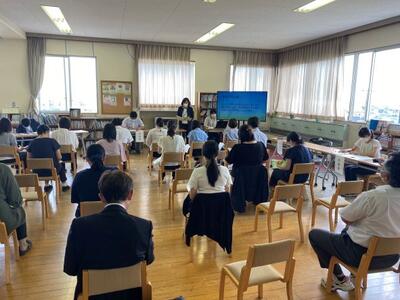 前半は全体会を行いました。全体会では、本校の研修主任から研究計画についての説明をしました。その後、これまでの実践として、先日行った5年生の「宿泊学習でのレクレーションを決める話し合い活動」について発表しました。演習として、国立教育政策研究所作成の「小学校特別活動映像資料」を参加者全員で視聴しました。