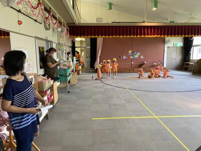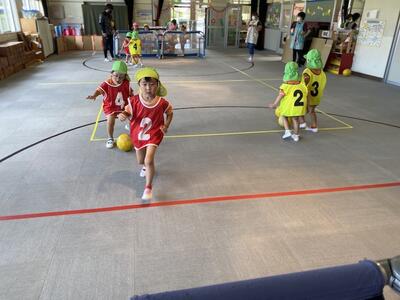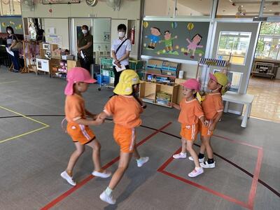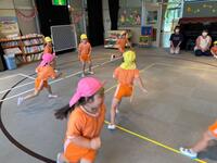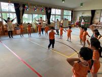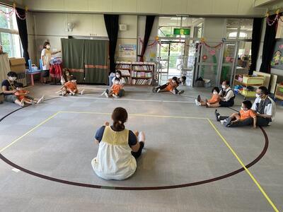 この日も朝から30度を超す猛暑でした。そのため、小学校の体育館での実施ではなく、園のホールで扇風機をフル回転させ、空気を循環させて行いました。それでも子ども達はすぐに汗でビッショリになるため、こまめに休憩をとり水分を補給させながら行いました。