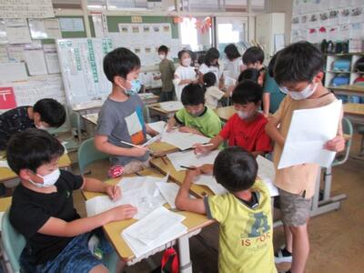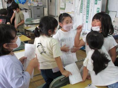 2年生は、生活科の学習で町探検を計画しています。30日(木)に馬場野・百槻方面。1日(金)に程田方面です。地域にある施設を調べてそこで働いている人や地域の人たちと関わることが目的です。そこで、目的地ごとにグループを作って、どんな質問をするかなどの計画を立てました。