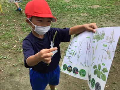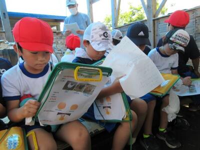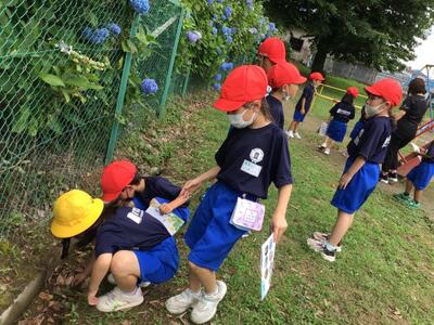 1年生は、生活科の「夏がやってきた」という学習で、校庭にいる虫や花を探しに行きました。 子どもたちは、「危険な生き物には近づかないこと」「時間を守ること」「校庭の行ってよい場所の確認」 等について約束をしてから、校庭に出かけました。ダンゴムシを何匹も見つけ、「たくさん見つけた!」と嬉しそうにしていました。えさや住処などを本で調べる子どももいました。夏に見られるツユクサ エノコログサを見つけて、ポケット図鑑(生活の教科書に付属されていたもの)で確認する子どもも見られました。夏になって、生き物がたくさん見られるようになったことを肌で実感した子どもたちでした。