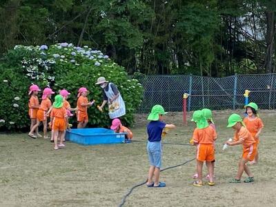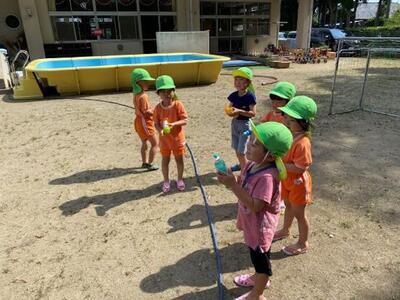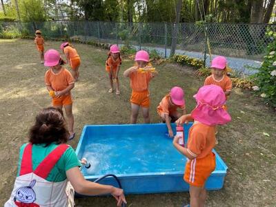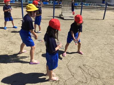 連日の猛暑。この日は、朝の段階で30度に達し、運動制限をする31度手前でした。幼稚園では、子ども達に少しでも涼しく楽しませようと、水遊びをしました。食器洗剤の容器で水を掛け合って遊んだり、色水遊びや水ずもうやプリンホッケーをして遊びました。 遊ぶ前に「足だけにお水かけようね」 と約束しましたが、遊んでいるうちにみんな楽しくり、そんお約束もすっかり忘れて全身ビチャビチャになりながら水遊びを楽しんでいました。みんなニッコニコ笑顔でとても楽しそうでした。