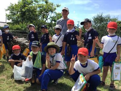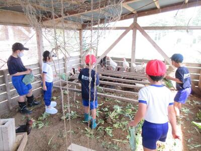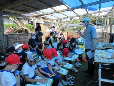 この日2年生は、百槻と馬場野方面への探検を計画していました。ところが、朝から30度を超え、運動制限がかるまで後わずかの気温まで上昇していました。そこで、学校近くの「マルタケ農園」さんだけのを朝一番で訪問させていただくことに予定を変更しました。