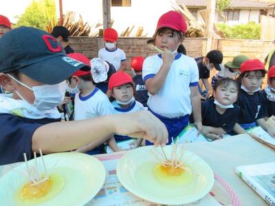 今年度の年少児は、「ようちえん、大好き!」「ともだち大好き!」で、毎日笑顔で登園してくる子が多くて、安心して子どもたちを受けとめ 1学期を過ごすことができました。 保育者や友達と一緒に遊びや活動することに不安になる子もいますが、少し時間が経つと、みんな興味をもって遊んでいます。 最後は「楽しかった!」「また、やりたい!」と満足して遊びを終えます。この思いを、意欲にしっかりつなげるようにしています。