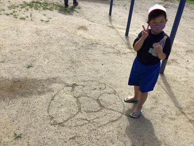 1年生は、生活科「夏がやってきた」の学習で、水で遊ぼうの活動を行いました。連日の猛暑の中だったので、束の間の涼を楽しみました。ペットボトルやマヨネーズの容器などを加工し、水鉄砲にして校庭に思い想いに水絵を描きました。