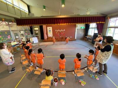 5月に誕生日を迎えたのは、さくら組1名・ちゅうりっぷ組1名の計2名でした。みんなでお祝いしました。さくら組さんの進行もすっかり慣れて堂々と進めていました。頼もしい成長を感じました。さくら組さんからのプレゼントは、手作りギター。ちゅうりっぷ組さんからのプレゼントは、手作りのメダル付きレイでした。みんな笑顔で嬉しそうでした。最後は、みんなでゲーム「猫とネズミ」をして楽しみました。
