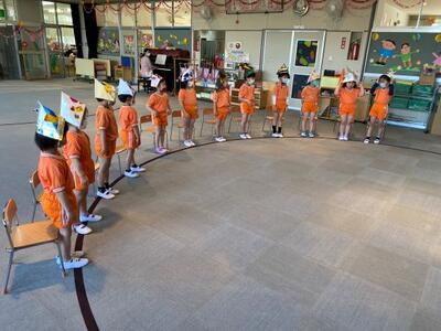 この日は、5月5日の「こどもの日」にちなんで、お祝い会を行いました。はじめに、「こいのぼり」をみんなで歌いました。次に、年少の木村先生に鯉のぼりにちなんだ「紙芝居」を読んでもらいました。そして、リズムダンス「はしるよ新幹線」お踊って、ゲーム「ナンバーコール」をしました。最後は、子どもの日と言えばの「柏餅」をおやつにいただきました。