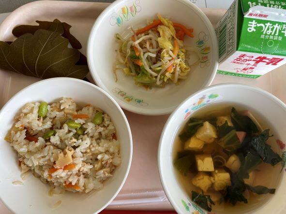 〇たけのこご飯 〇牛乳 〇おかか和え 〇すまし汁 〇柏餅