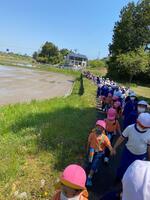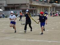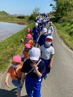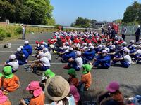 一時避難場所である校庭には、話をせずに素早く避難することができました。大津波に備えた二次避難は、30分の余裕があるために蒼龍寺に避難をします。蒼龍寺までは距離があるため、6年生が幼稚園児の手を引いて避難しました。こちらも、スムーズに避難をすることができ、消防署員の方から「立派でした」と講評いただきました。
