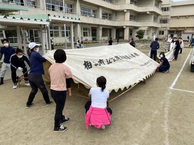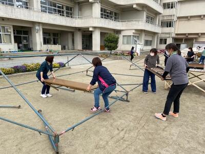 21日(土)のスポーツフェスタに備え、PTA本部役員と厚生委員の皆様が前日準備をしてくださいました。子どもたちのテントと遊具の固定やグラウンド整備をやっていただきました。