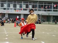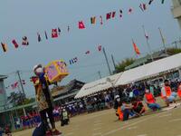 私が着ているハッピは、震災の時に山本寬斎さんから頂戴してPTA会長さんと校長が運動会の時に着る伝統になっているということで、初めて袖を通して参加しました。