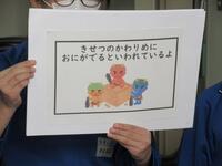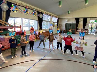 会では、はじめに「豆まきの歌」を歌い、次に節分にまつわる「紙芝居」をみて、一人一人が「自分の追い出したい鬼」を発表しました。最後に、鬼ヶ島に自分が作った鬼を飾って豆まきをしました。」