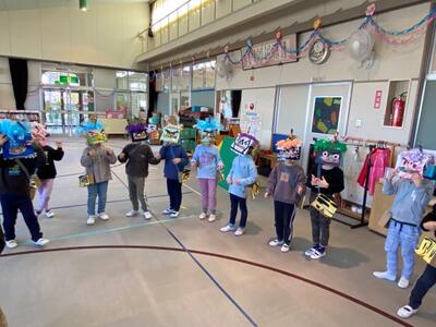 節分に合わせて、豆まき集会を行いました。年少さんも年長さんも、段ボールや厚紙を使って思い思いに鬼の面をつくって集会に臨みました。とても個性的で味のあるお面が出来上がりました。